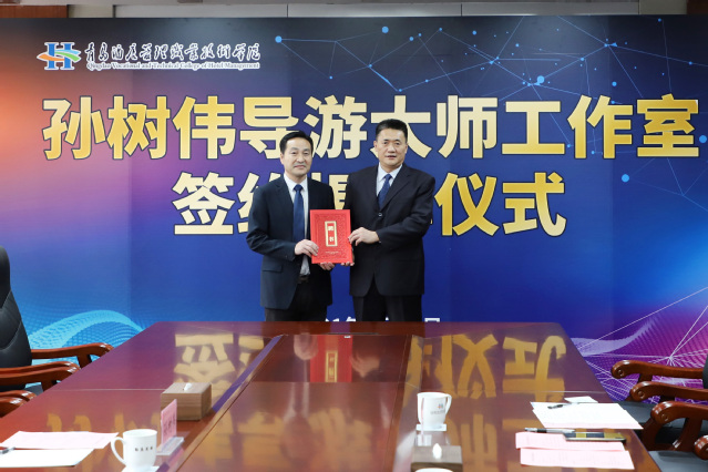 孙树伟表示,十分荣幸受聘为学院现代产业导师,将依托工作室广泛开展工作,秉承工匠精神,传承导游技能,积极在学院团队队伍建设、线上教学资源开发等方面落地落实合作项目,为学院“双高计划”建设工作和高质量发展贡献力量。
