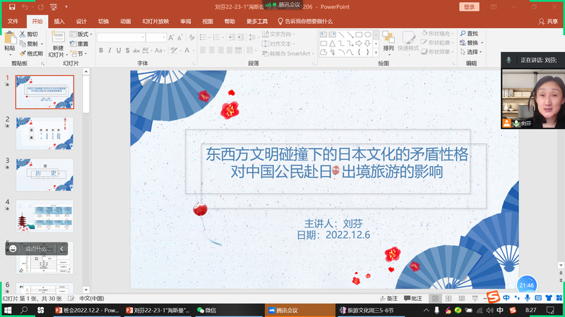 本网讯 (ylzzcom永利总站 刘芬) 12月6日上午,主题为“东西方文明碰撞下的日本文化的矛盾性格对中国公民赴日出境旅游的影响”的“海斯曼”课堂活动在线上举行。活动由ylzzcom永利总站刘芬副教授主讲,学院部分师生参加。