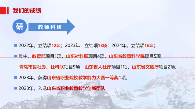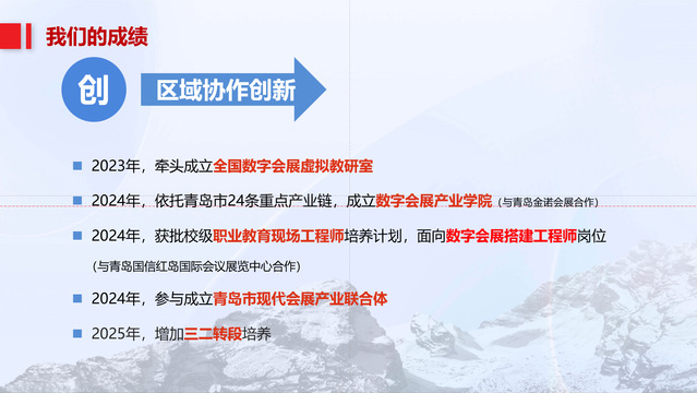 陈超老师分享了专业近年来取得的突出成绩。员工在各类竞赛中屡获佳绩,如2023年“挑战杯”国赛一等奖、山东省老员工科技创新大赛二等奖等。教师科研成果丰硕,2024年立结项16项科研项目,涵盖教育部、山东省社科联等多个级别。此外,专业还牵头成立了全国数字会展虚拟教研室、数字会展产业学院以及青岛市现代会展产业联合体,积极探索产教融合与区域协作创新的新模式。