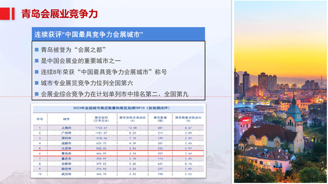 陈超老师深入分析了青岛市会展业的发展现状。青岛作为“会展之都”,连续8年荣获“中国最具竞争力会展城市”称号,会展业综合竞争力在全国排名第九,计划单列市中排名第二。2023年,青岛举办207场展览,展览面积达464.09万平方米,位居全国第六。2024年,已举办超300场展会节庆活动,展览面积达410万平方米,展现了强劲的发展势头。