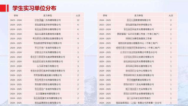 活动现场,陈超老师展示了过去两年员工实习单位的分布情况。2023-2024学年和2024-2025学年,员工实习单位涵盖会展运营、广告传媒、旅游管理、文化传播等多个领域,包括青岛金诺国际会展有限公司、山东中瑞国际会展有限公司等知名企业,为员工提供了多元化的实践机会。